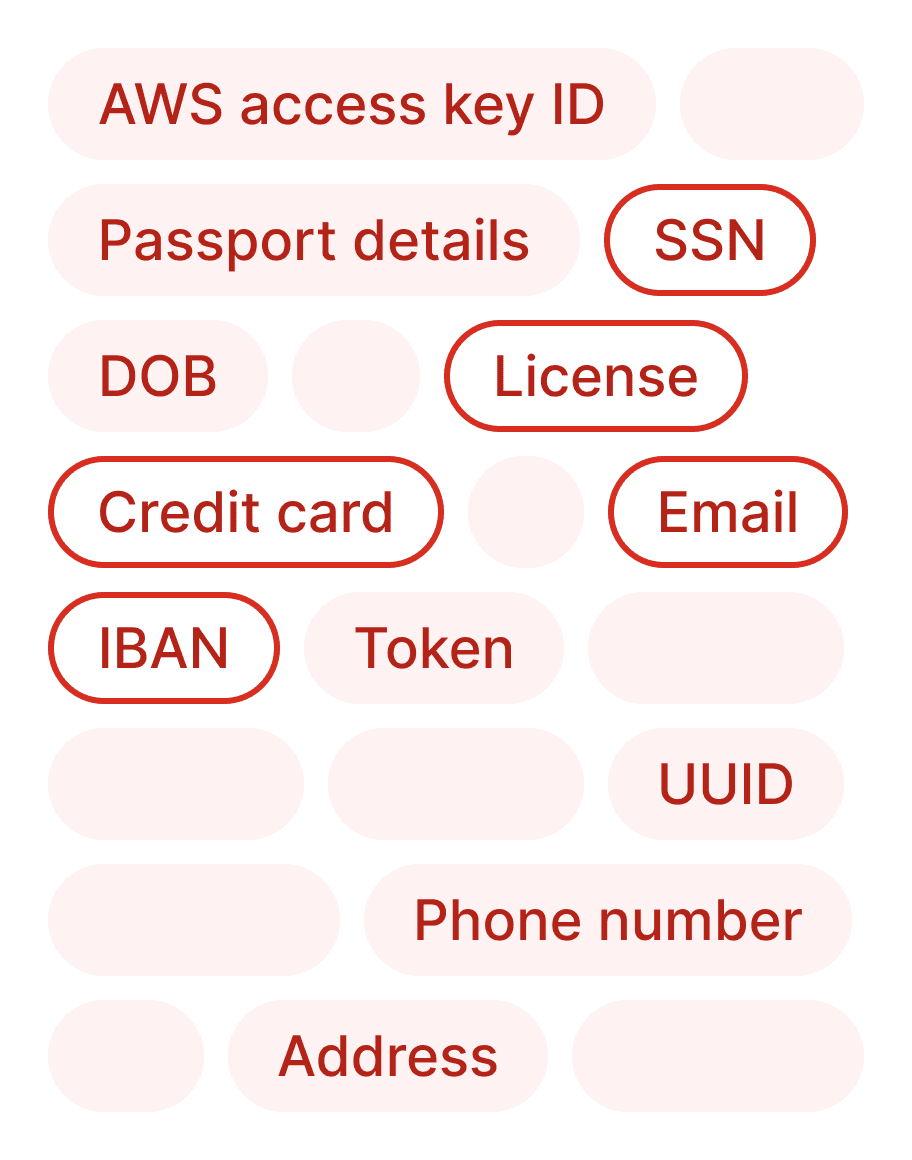 100+ sensitive data types including SSN, Credit Card, email, AWS keys, tokens, payment information. Add your own custom Data Type.