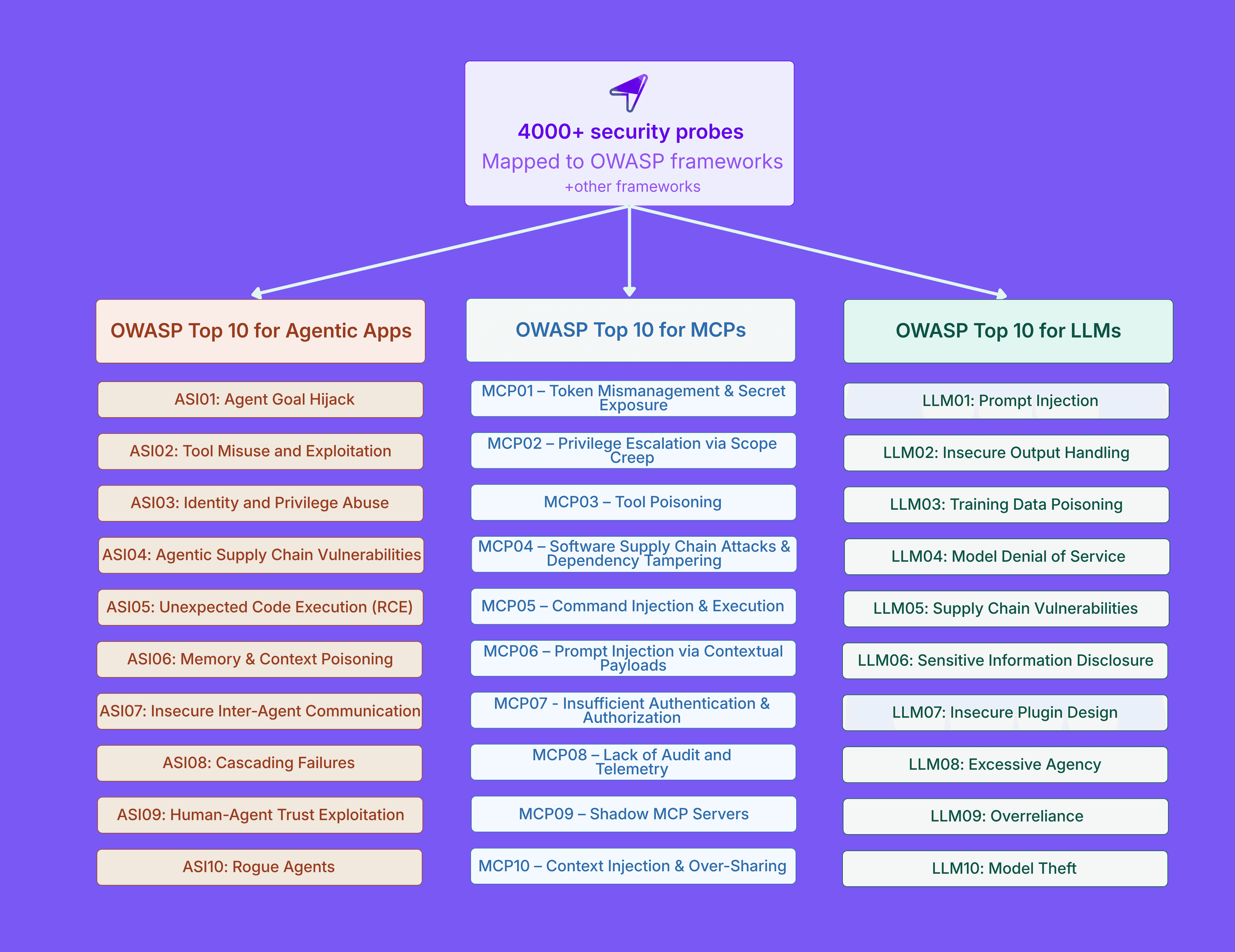 The probe library includes over 4,000 purpose-built probes that map directly to every risk category across the OWASP Top 10 for LLMs, the OWASP Top 10 for Agentic Applications, and the OWASP MCP Top 10.